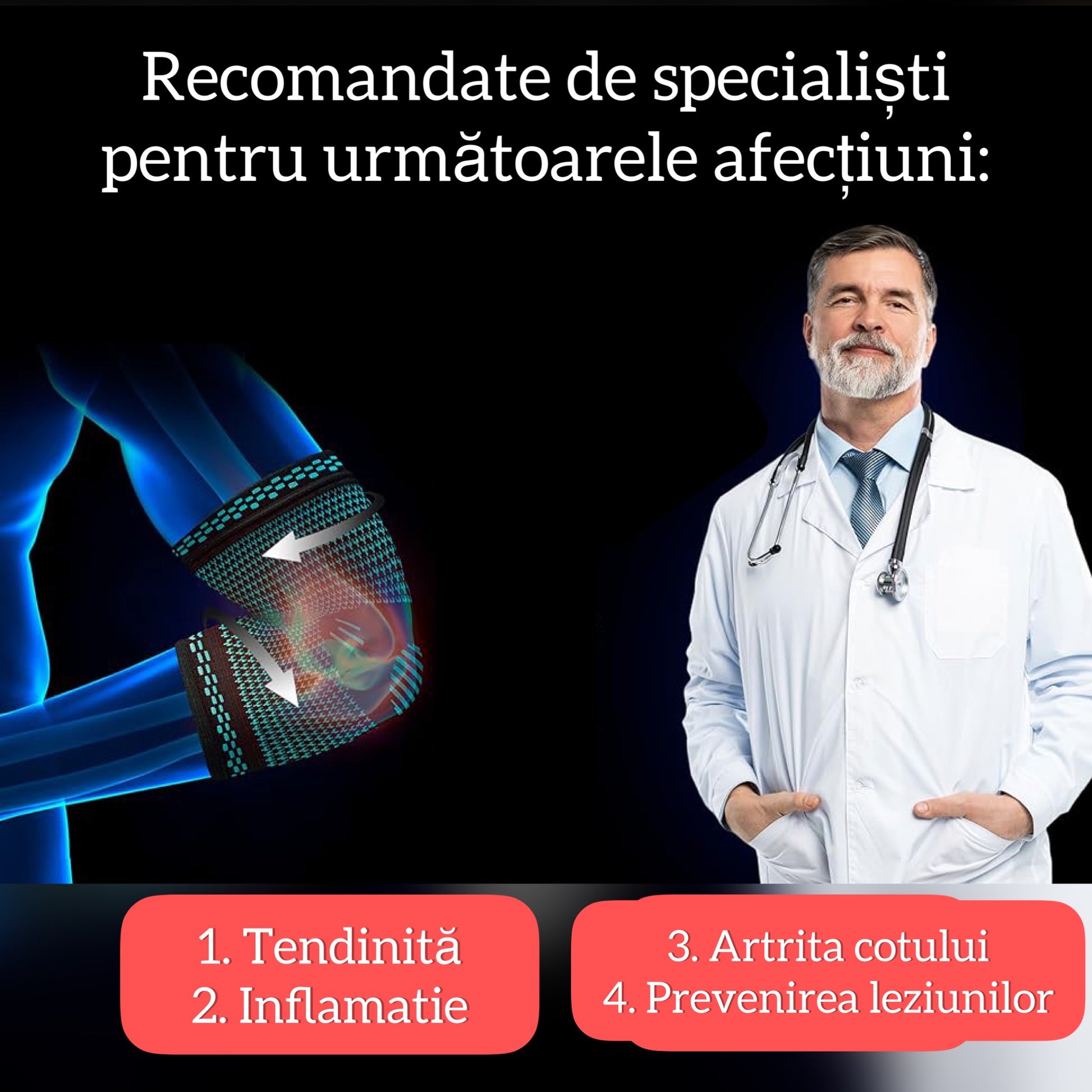 Artrita cotului: În cazul artritei, compresia ușoară poate ajuta la menținerea articulației cotului într-o poziție mai confortabilă și la reducerea durerii.